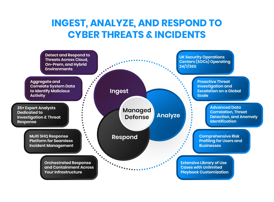 Our comprehensive Managed Defense solutions leverage AI-driven threat intelligence, behavioral analytics, and expert security operations to detect and neutralize cyber threats before they escalate. With 24/7 monitoring, rapid incident response, and advanced security automation, we empower organizations to stay resilient against evolving cyberattacks, ensuring business continuity and compliance with industry regulations.